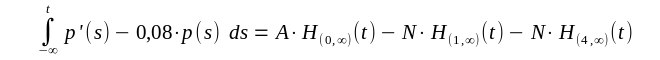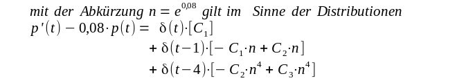 | Diese Gleichung ist natürlich im Sinne der Distributionen zu verstehen. Und für die Stammdistribution von p'(t) - 0,08 p(t) ergibt sich |